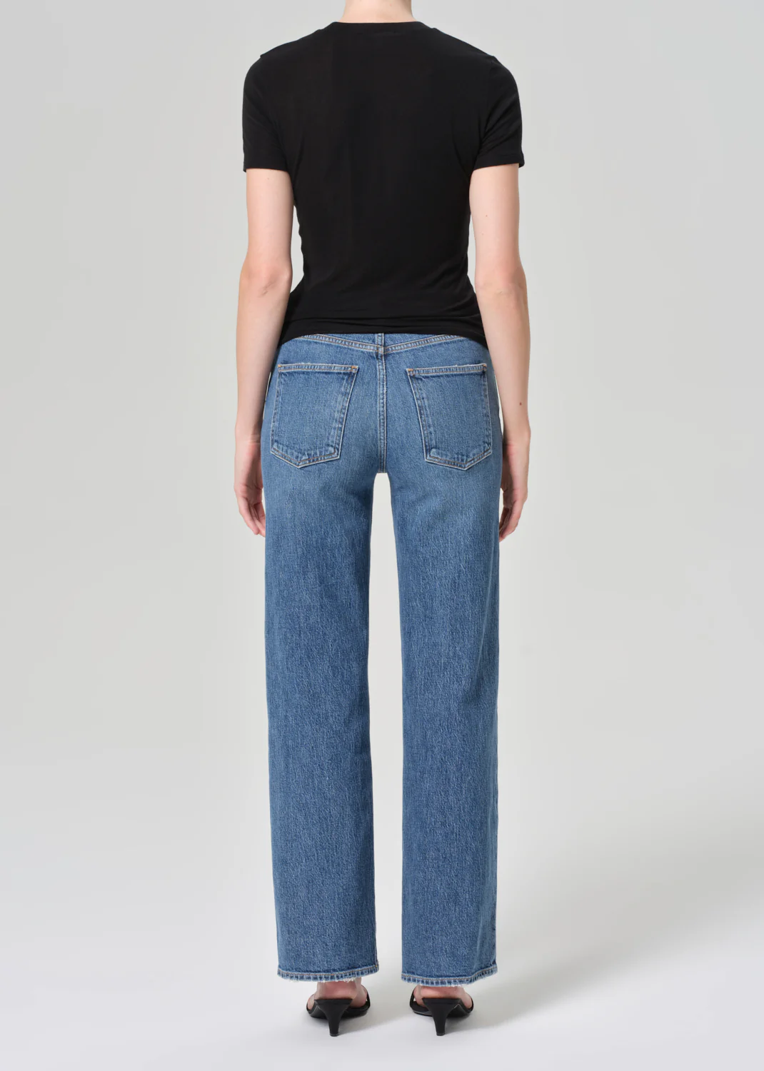 The Harper is crafted from recycled cotton with just the right amount of stretch for comfort. Featuring a relaxed mid-rise fit, it has a flattering square top block and a straight leg. Made in vintage indigo denim with fading and whiskering throughout, it offers a perfectly worn-in, vintage look. A versatile piece that pairs effortlessly with everything from casual tees to elevated tops.